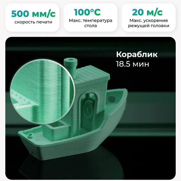 Активное устранение вибраций на осях XY предотвращает появление артефактов на поверхности готовой детали. Алгоритм регулирования давления экструзии обеспечивает консистентную подачу материала – в результате печать плавная и детальная, а качество слоев стабильное на каждом этапе.