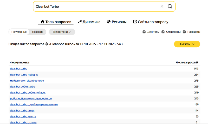 Модель, вышедшая в свет в январе 2025 года, очень быстро стала популярной: согласно Яндекс.Вордстат, уже в начале весны количество запросов, касающихся мойщика Cleanbot Turbo, значительно выросло — со 107 в феврале до 1387 в марте. Популярность сохраняется до сих пор — ежемесячно модель ищут почти 550 раз.