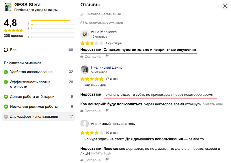 Слишком сильное воздействие для чувствительной кожи | При работе на высокой мощности у некоторых пользователей возникает ощутимый дискомфорт. Чтобы уменьшить неприятные ощущения, производитель рекомендует попробовать использовать массажер с небольшим количеством геля или по тканевым маскам с гелевой пропиткой. | 22 из 108 |