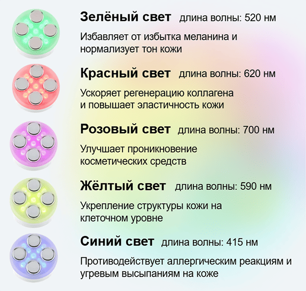 - LED-терапия улучшает состояние кожи (эффект зависит от выбранной длины волны/цвета).