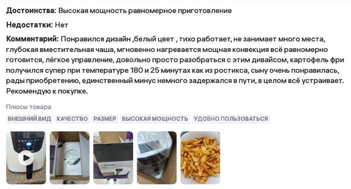 Функциональность | Аэрогриль сможет заменить фритюрницу, приготовить выпечку, овощи, мясо, птицу, рыбу и т. д. | 43/88 |