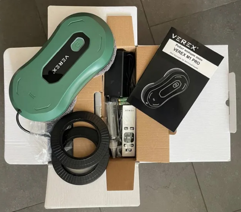 Небольшие размеры и такой же вес делают прибор максимально надежным, «цепким» и маневренным. Вместе с роботом-мойщиком VEREX M1 PRO покупатели получают 10 салфеток для уборки, 2 запасных колеса-держателя, пульт дистанционного управления (с батарейками), зарядное устройство, страховочный трос, инструкцию на русском и флакон для жидкого моющего средства (воды). Длина его сетевого шнура — 4 метра. Гарантийный срок — 1 год.