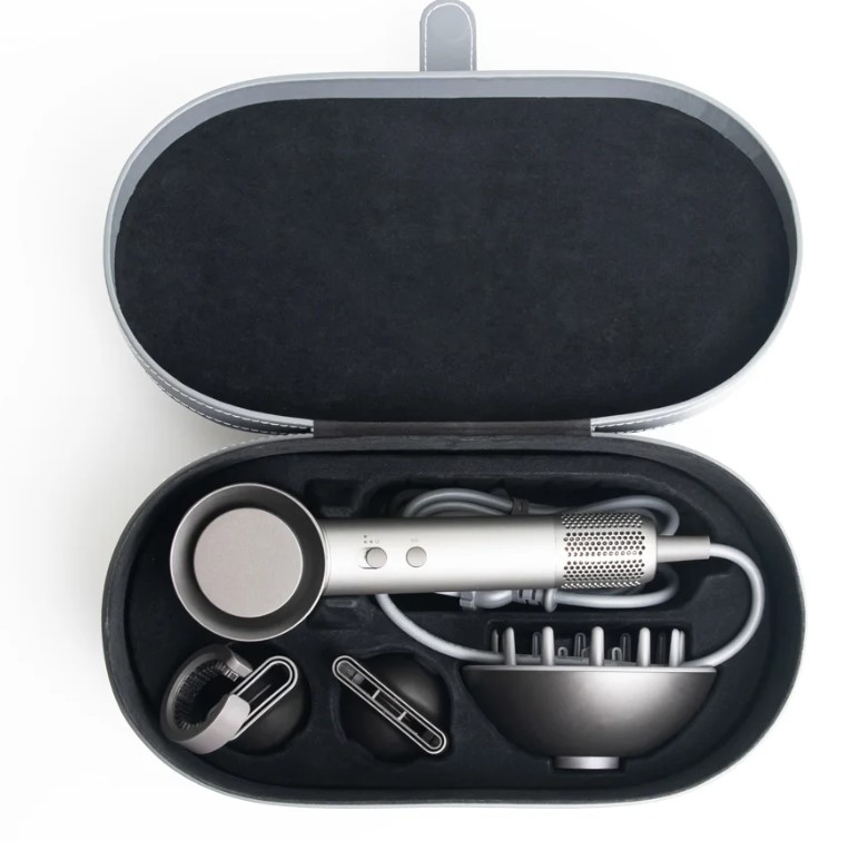 - сам фен и аксессуары аккуратно разложены в стильном и прочном кейсе, покрытом экокожей, приятной на ощупь;