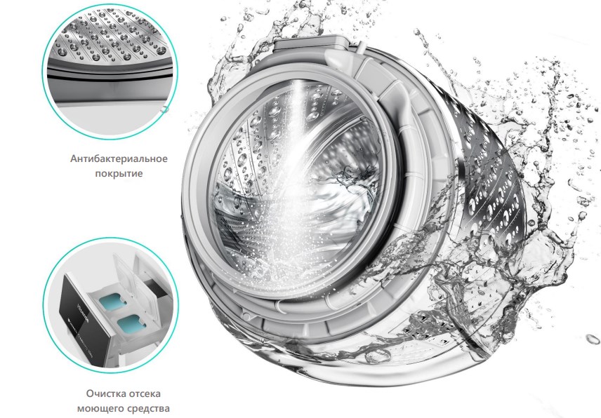 Забота о гигиене. Производитель тщательно позаботился об этом аспекте. Очистка барабана помогает избавиться от остатков чистящего средства, частичек тканей и других загрязнений, температура воды при этом может превышать 90 градусов, что губительно для бактерий. Специальная система Pure Jet, разработанная компанией Hisense, подает воду в барабан под напором, таким образом эффективно растворяет моющее средство и не дает остаткам скапливаться в лотке. Предусмотрена дополнительная очистка отсека для моющего средства. Стерильное покрытие манжеты предотвращает развитие на ней патогенной микрофлоры. Все это в совокупности позволяет сохранить чистоту техники.