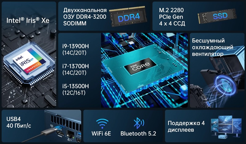 Мини ПК GEEKOM Mini IT13 ориентирован на требовательные к ресурсам задачи, поэтому его начинка строится вокруг максимально свежих решений Intel. Да, это все же мобильные технологии, но 13-я генерация чипов весьма интересна. На выбор в России предлагаются два процессора 2023 года: i7-13700H и i9-13900H. Оба используют ноутбучный сокет BGA-1744, построены на архитектуре Raptor Lake-H с техпроцессом Intel 7 и получили по 14 (6+8) ядер с поддержкой 20 потоков данных. В бусте первый выдает до 5.0 ГГц тактовой частоты, вторая версия чуть производительнее – до 5.4 ГГц. Средний TDP обоих чипов в районе 45 Вт и они без проблем переносят температуры до 100 градусов. За обработку графики отвечает ядро Intel Iris Xe Graphics с максимальной частотой 1500 МГц, 768 шейдерными и 96 вычислительными блоками. Есть еще вариант с чипом i5-13500H, но он ощутимо проседает по возможностям, плюс предлагает меньше ОЗУ, поэтому покупать его не рекомендуем.