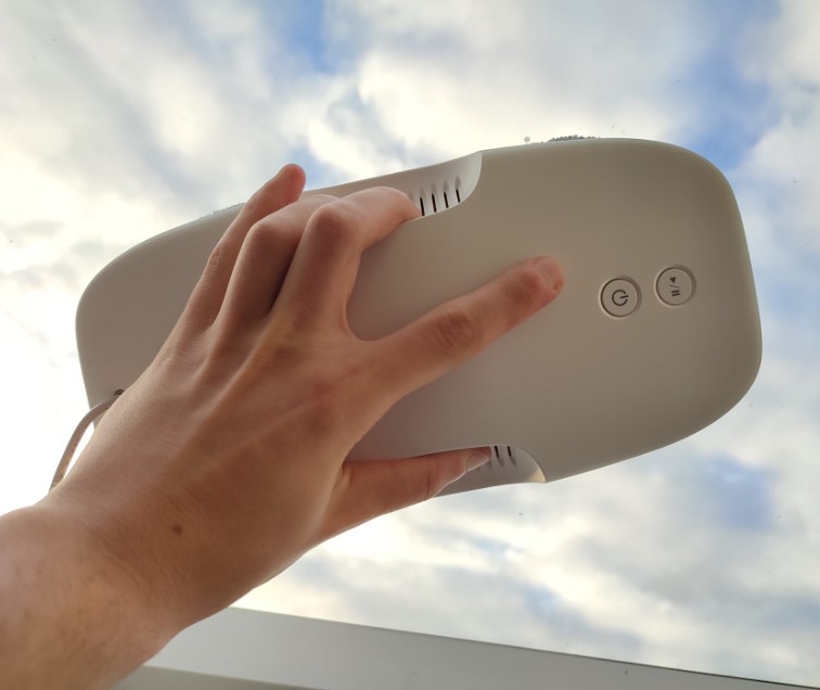 За счет вытянутой прямоугольной формы устройство получилось не таким громоздким, как квадратные мойщики окон. Два крутящихся диска с салфетками из микрофибры немного выходят за края корпуса, чтобы добиться лучшей эффективности уборки в труднодоступных углах. Приблизительные размеры – 37.5*31.5*8.5 см. Длина сетевого шнура составляет 5 м.