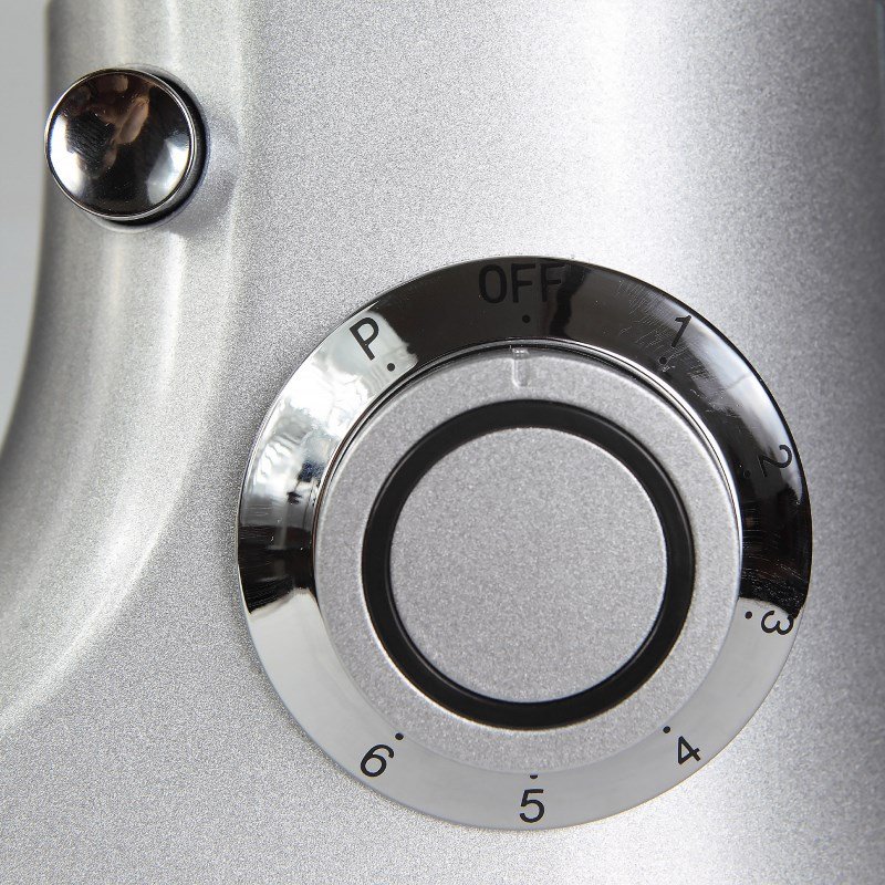 Как видно на фотографии, каждой скорости присвоен порядковый номер. Они расположены по часовой стрелки в порядке возрастания. Ход пошаговый. Для начала работы нужно лишь подвинуть регулятор с режима покоя "Off" на выбранную скорость. Менять скорость Redmond RKM-4035 позволяет и в процессе работы аналогичным способом. Модель отличается очень плавным переключением между режимами, благодаря чему можно не опасаться рывков и скачков даже при кардинальной смене скорости, например, с первой на шестую. Также на поворачивающийся регулятор нанесен значок "P", обозначающий "импульсный режим". Для кратковременного ускорения до максимума достаточно перевести регулятор в данный режим на несколько секунд, после чего вернуть в прежнее положение.